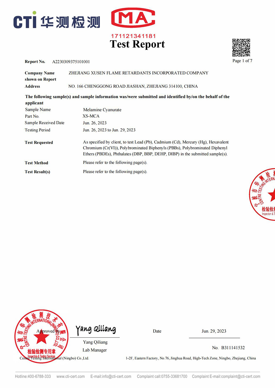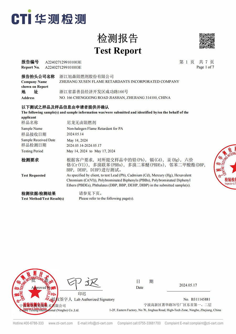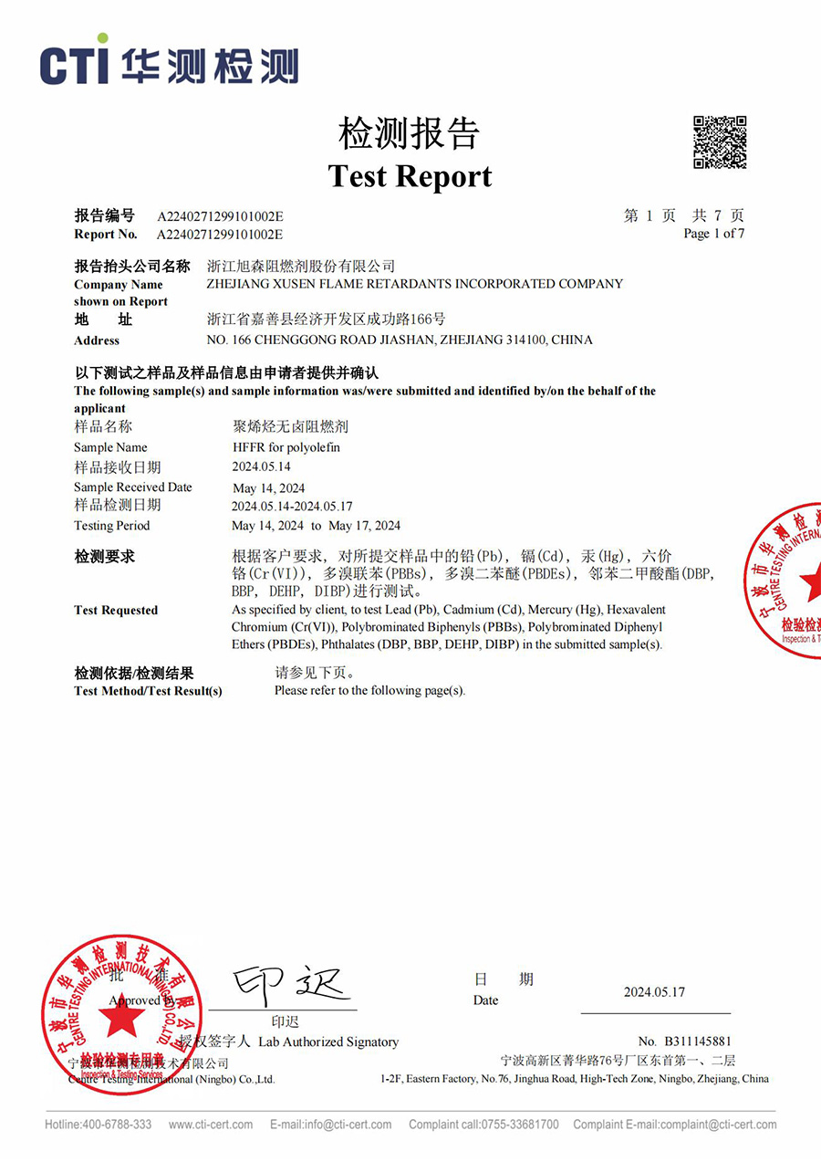 Vlamvertrager voor Polyolefin ROHS -testrapport